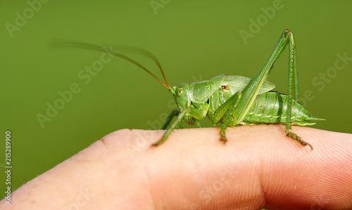 Fototapeta premium Heuschrecke, Grünes Heupferd auf Finger