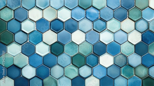 © thinnathee, Naklejka premium Hexagonal Blue and Green Mosaic Tile Pattern for Interior Design
