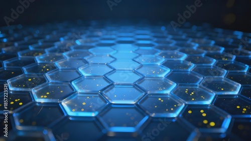 Obraz premium Hexagonal grid with glowing blue tiles and yellow particles in a futuristic...