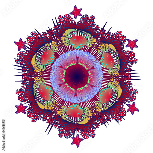 Obraz premium Hexagonal ornament with crabs, starfish and actinia in Art Nouveau style. Intricate composition, bright colours. Mandala tatoo. Textile print. EPS10 vector illustration.