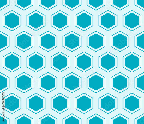 Fototapeta premium Hexagonal pattern background. Cyan color on matching background. Hexagon mosaic cells with padding and inner solid cells. Large hexagon shapes. Seamless pattern. Tileable vector illustration.