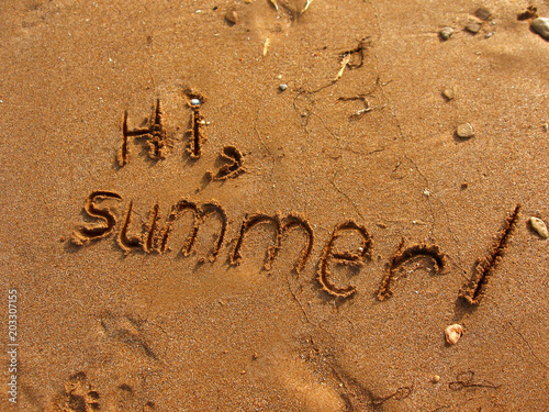 © Margarita Lyr, Fototapeta premium Hi, Summer written on the sand. Textured sandy template for vacation concepts. Natural sea beach background