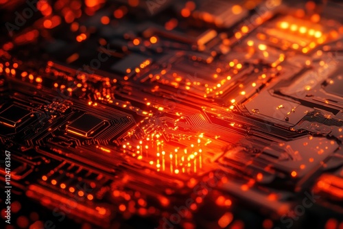 © Vooglo.com, Obraz premium Hi-tech semiconductor manufacturing precision laser engraving machine glowing red and orange lights close-up shot