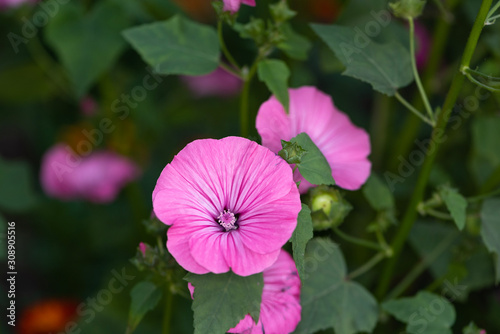 Fototapeta premium Hibiscus flower in a garden. Pink flower close up.