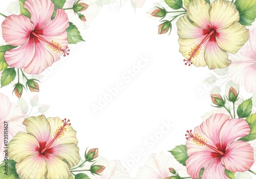 © Shahida, Fototapeta premium Hibiscus Flower Watercolor Border with Leaves and Buds on White Background