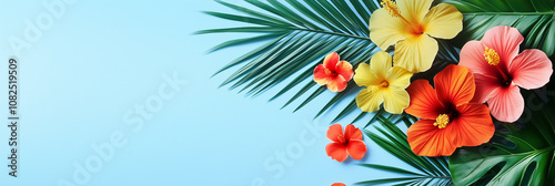 Obraz premium Hibiscus Flowers and Palm Leaves on Blue Background