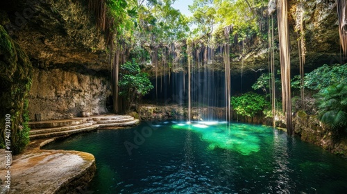 Naklejka premium Hidden Cenote with Emerald Water and Cascading Waterfall
