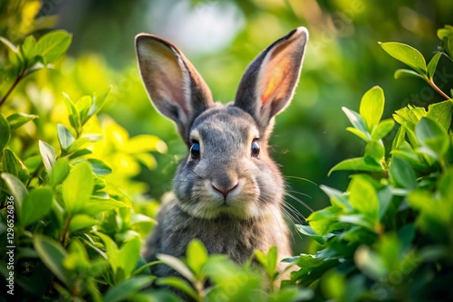 © Four888, Fototapeta premium Hidden Gray Rabbit in Bush: Cute Wildlife Stock Photo with Copy Space