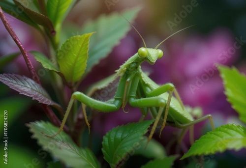 Naklejka premium Hidden Hunter A Detailed Study of a Praying Mantis Perfectly Camouflaged Among Lush Greenery, Revealing Nature s Mastery of Disguise