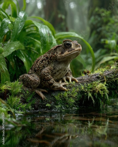 © nichar, Fototapeta premium Hidden Lives of the Amboli Toad – Camouflage and Survival in the Western Ghats Amboli Toad Resting on Mossy Branch Over Forest Stream in Light Rain