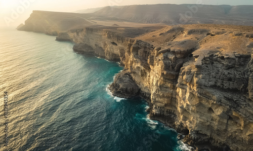 © goami, Obraz premium hidden rocky island surrounded by blue waters and coral reefs, golden sunlight reflects on waves, untouched, rugged terrain