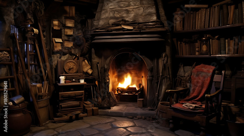 Naklejka premium Hidden Witch's Study and Medieval Workshop with Stone Fireplace, Books and Alchemist's Tools