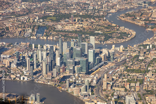 © Thomas, Fototapeta premium High aerial view of downtown city of London, with river Thames, the Shard, Tower bridge, HMS Belfast and may buildings, squares, offices. embankment, taken from airplane