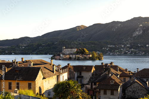 © Olga, Fototapeta premium High angel view of San Giulio Island on the Lake Orta in a springtime, april 2025, Piedmont, Italy. Basilica di San Giulio. Benedictine monastery.