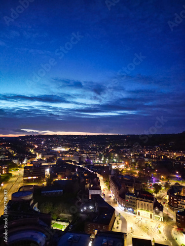 © Altaf Shah, Fototapeta premium High Angle Night View of Dover Coastal City of South Eastern County of Kent England, United Kingdom. The Illuminated Footage Was Captured with Drone's Camera after Sunset Night of April 20th, 2024