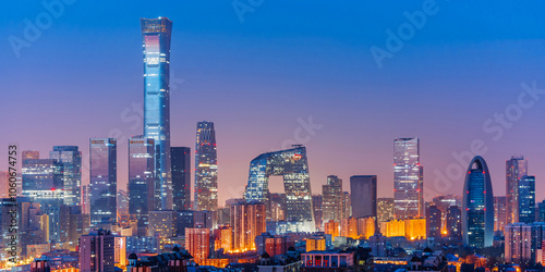 Obraz premium High angle night view of the Beijing Guomao CBD architectural complex in China