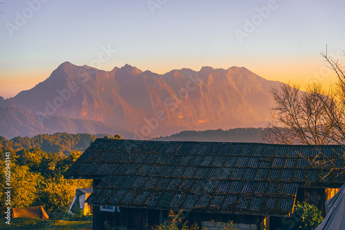 © Pang wrp, Obraz premium High-angle view of a beautiful orange, pink, and yellow sky in the evening as the sun sets. There is a view of Doi Luang Chiang Dao Mountain in the center of the image, which has a unique shape.