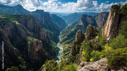 © Akbar, Fototapeta premium High-angle view of a deep canyon with a river winding through