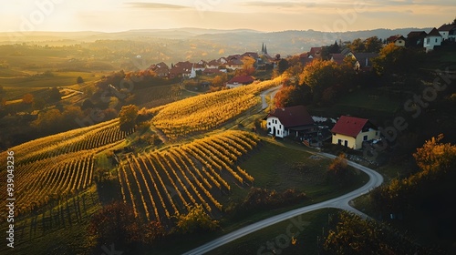 © TheseusStock, Naklejka premium High-angle view of a picturesque vineyard in autumn.