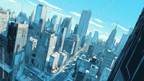 © achmad, Obraz premium High-angle view of a stylized cityscape with skyscrapers and streets.
