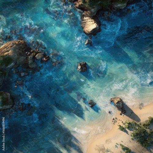 Obraz premium High-angle view of a turquoise coastal scene. Rocky outcrops and waves meet a sandy beach