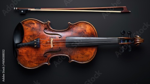 Fototapeta premium High-angle view of a violin and bow on a dark background