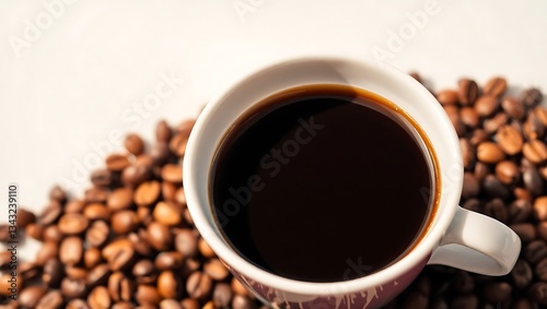 Fototapeta premium "High Angle View of Black Coffee in a White Cup on a Bed of Coffee Beans"