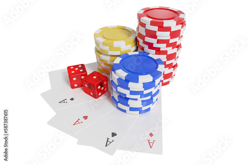 Obraz premium High angle view of casino tokens with dice and playing cards