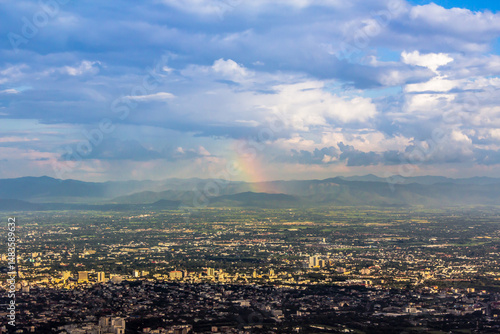 Obraz premium High angle view of Chiang Mai, Thailand with mountains and rainbow sky as a...