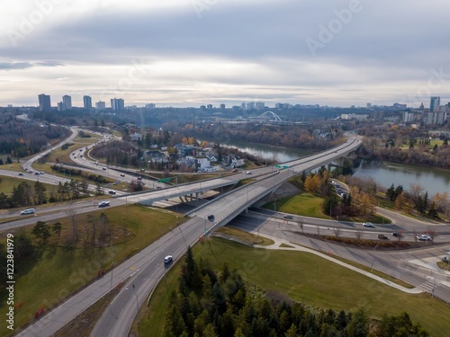 © Zenstratus, Fototapeta premium High-angle view of Edmonton city highway intersection over a river, with cars traversing the overpass. Urban landscape surrounds the roadway. Cloverdale, Edmonton, Alberta, Canada