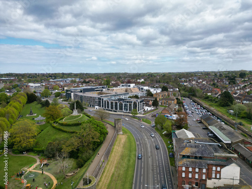 © Altaf Shah, Fototapeta premium High Angle View of Historical Canterbury City of Southeast England United Kingdom. April 20th, 2024, Aerial View Was Captured with Drone's Camera From High Altitude