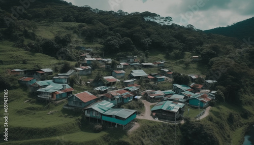 Fototapeta premium High angle view of mountain range, green landscape, rural hut generated by AI