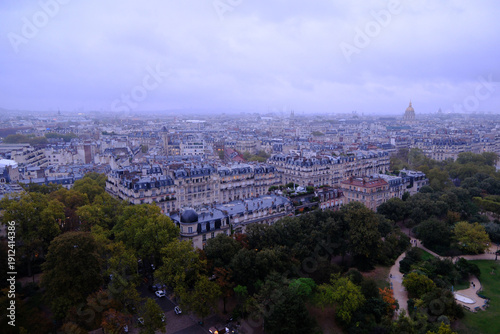 © Robert, Fototapeta premium High-angle view of Paris cityscape under an overcast sky featuring Haussmann architecture and Les Invalides