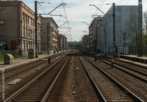 © Dewi, Fototapeta premium high angle view of railway tracks against building