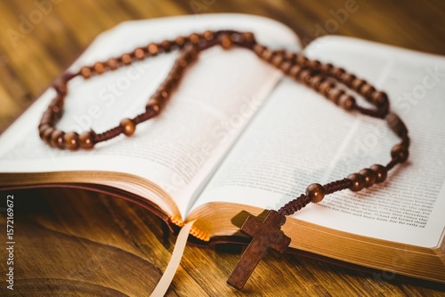© vectorfusionart, Fototapeta premium High angle view of rosary beads on open bible