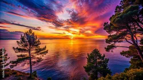 © Man888, Fototapeta premium High Angle View of Silhouetted Trees Against the Serene Sea at Sunset, Capturing Nature's Tranquility and the Beauty of Coastal Landscapes