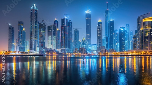 © chutikan, Fototapeta premium High angle view of skyscrapers in the financial and business district at night with lights in a modern big city.