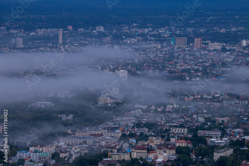 Obraz premium High-angle view of the city with mist passing through. Many buildings in Chiang Mai, Thailand