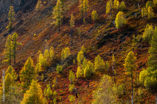 Fototapeta premium High angle view of trees in the Altai Mountains during Autumn