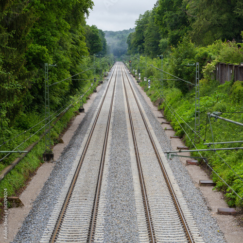 Fototapeta premium High angle view of two railway tracks leading into the distance. Symbol for...
