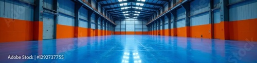 Obraz premium High-bay warehouse, striking blue epoxy floor, warm orange light accents,...