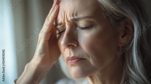 © SnapNest, Obraz premium High blood pressure risk concept. A woman experiences distress, holding her forehead, conveying emotions of pain or stress in a serene indoor setting.