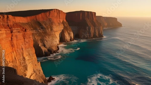 Fototapeta premium High cliffs against the sea, sun on the horizon, dramatic shadows and light transitions, minimalist landscape, strong sense of nature.