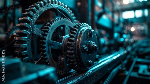 © Lakkhana, Fototapeta premium High-contrast image of shiny metal gear wheels in a dark industrial environment