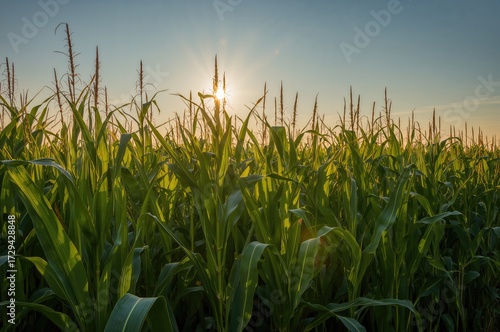© Emin, Fototapeta premium High corn plants stretch upward in a lush green landscape bathed in the soft light of sunset. This thriving harvest symbolizes hardworking agriculture and the richness of natural rhythms.
