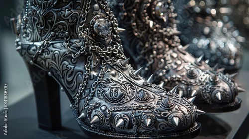 © Alpha, Obraz premium High-definition close-up of high heels on slender legs, emphasizing the sleek design of the shoes and the street's gritty texture