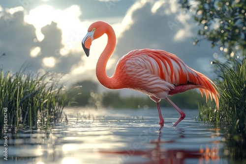 © YUANCEN, Fototapeta premium High-definition 3D illustration of a flamingo walking gracefully on grass near water against a serene sky background.