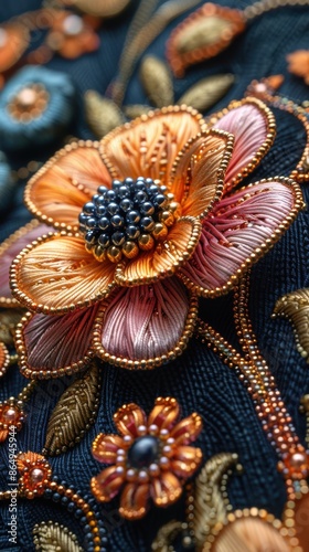 Naklejka premium High-definition image of intricate beadwork on a traditional textile, 8K,...