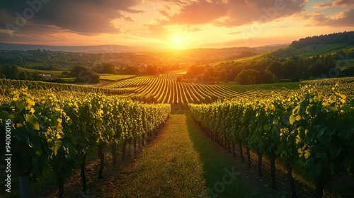 Fototapeta premium High-definition view of a lush vineyard at sunset perfect for serene and...