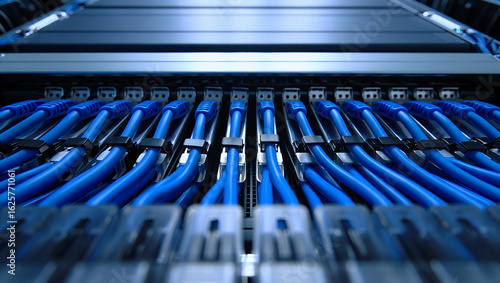 © Taohidul, Obraz premium High Density Server Infrastructure with Blue Ethernet Cables Connecting Patch Panel Ports in Data Center